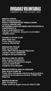 «A la hora de pensar en la naturaleza, y en particular en el paisaje andino patagónico, pocas imágenes son tan directas y elocuentes de cómo hemos modificado para siempre nuestros ecosistemas, como un pinar quemándose en la ladera de una montaña«, posteó un turista que, en plenas vacaciones, se topó con el incendio en Puerto Patriada. El video muestra las llamas consumiendo una ladera del cerro Pirque, que divide El Hoyo de Epuyén. Junto con el desfinanciamiento del Servicio de Manejo del Fuego, el monocultivo de pinos -un árbol no autóctono e inflamable- es un reclamo histórico de las organizaciones vecinas. Los voluntarios colaboran con los brigadistas llevando motobombas caseras, machetes y botellas de agua.