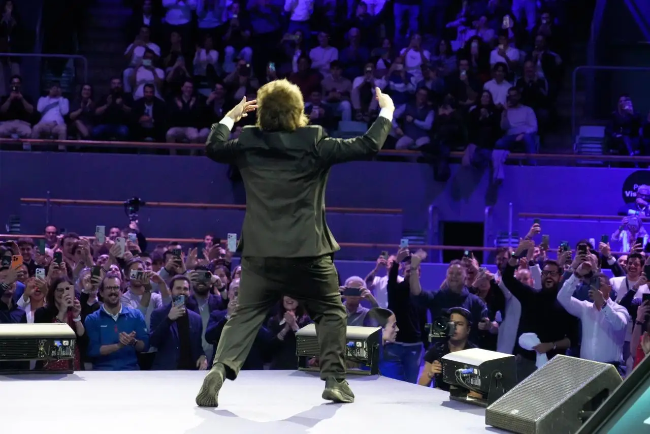 Como si jugara de local, Milei subió al escenario del Madrid Economic Forum 2026 –un foro de economistas, empresarios y políticos de extrema derecha– al ritmo de la canción Panic Show y al grito de “Viva la libertad, carajo”. El público, según informó EFE, lo acompañó con insultos contra Pedro Sánchez.
