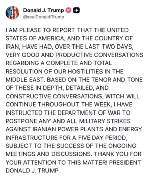 A través de un mensaje publicado en su red social, Trump anunció que ordenó posponer por cinco días los ataques contra instalaciones energéticas iraníes. La medida, explicó, responde al “tono y tenor” de las conversaciones en curso, que describió como profundas, detalladas y constructivas. El aplazamiento, sin embargo, quedó sujeto a los avances que puedan registrarse en los próximos días.