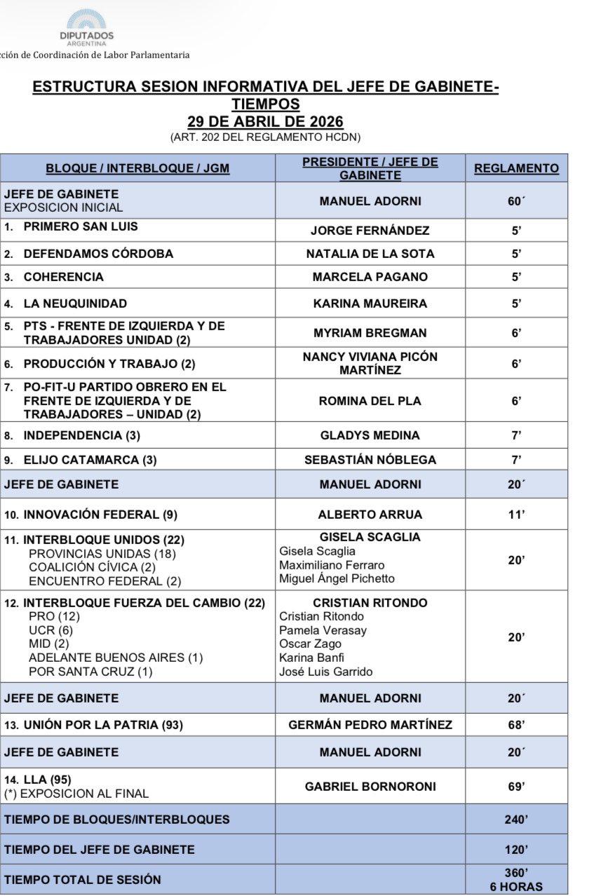 Adorni abrirá con un discurso de 60 minutos. Luego será el momento de las preguntas, que estarán repartidas en tres grupos. El primero esta dedicado a los nueve bloques más chicos de la Cámara. Nadie hablará menos de cinco minutos, pero los discursos serán proporcionales a la dimensión de cada espacio.