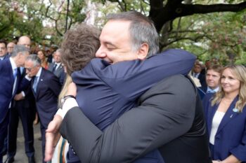 También estuvo presente el jefe de Gabinete y vocero presidencial, Manuel Adorni, quien se fundió en un abrazo con Milei durante el acto. Se trata de una señal de apoyo para el funcionario, quien fue imputado por los delitos de «dádivas» y «enriquecimiento ilícito» y aún no sorteó las acusaciones sobre su patrimonio.